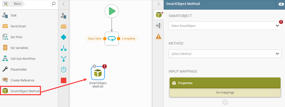 - From the Toolbox click the Basic category, and then click and drag the SmartObject Method step onto the canvas.