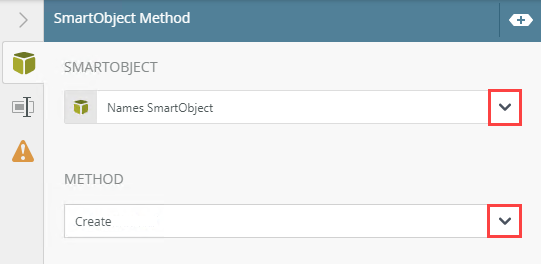 - In the SmartObject section, select the Browse option from the menu. Browse and select a SmartObject. In this example, the SmartObject (Names SmartObject) has two properties - ID and Name. The loop function loops through the static values and creates an entry, for each value, into the Name property within the SmartObject. In the Method section select Create from the menu.