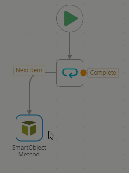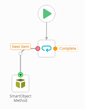 - Drag a line from the Next Item port (on the Loop step) to connect it to the SmartObject Method step.