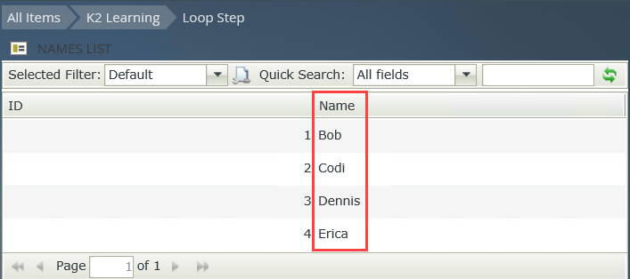 - Run a view on the Names SmartObject. In this example, the view is Names List View. Values from the static list created in the Name field of the SmartObject.