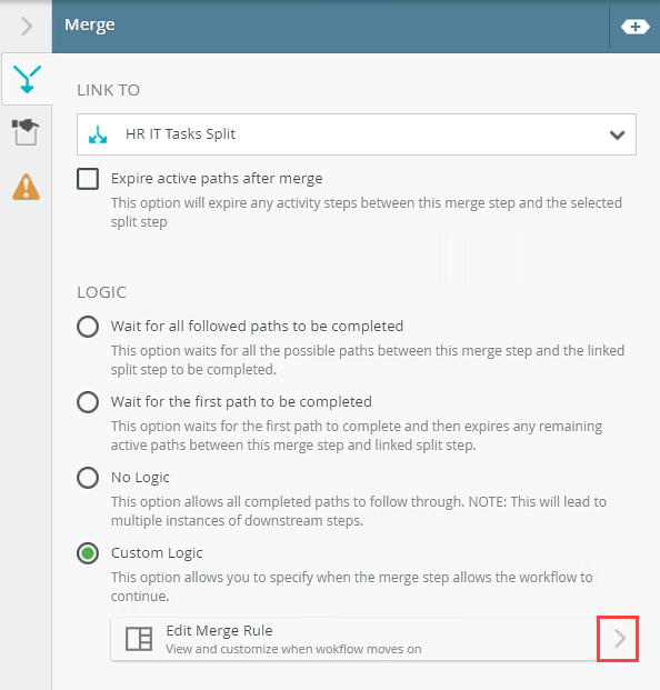 Use the Merge step to bring parallel paths within the workflow back together into a single path. A Merge step has to link to a Split step within the workflow. This is a prerequisite when adding a Merge step. This step is also a quick way to identify where parallel paths converge in the workflow diagram. You decide when a Merge step can move on by customizing rules around the Merge step in order to suit your business requirements.