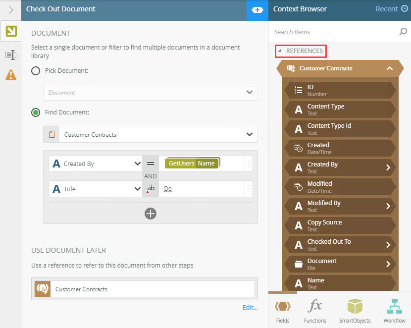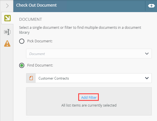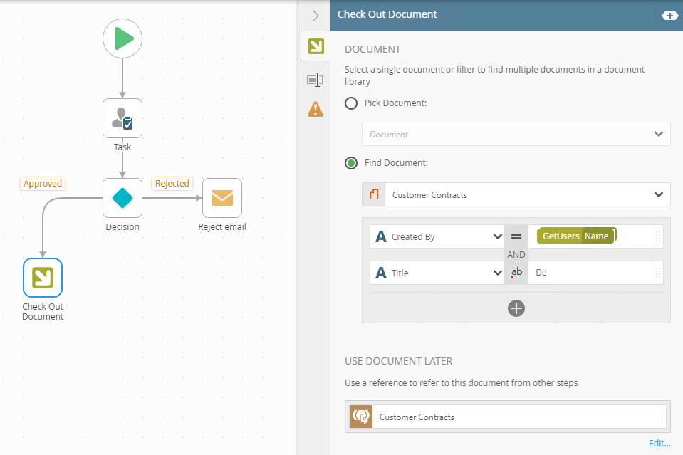 Use the Check Out Document step to check out a document from SharePoint so it can be modified. To commit the changes to the document, you need to also add a the Check in Document step to check the document back in to SharePoint. You can, for example, use the Check Out Document step as part of a business application to check out a document and modify it.