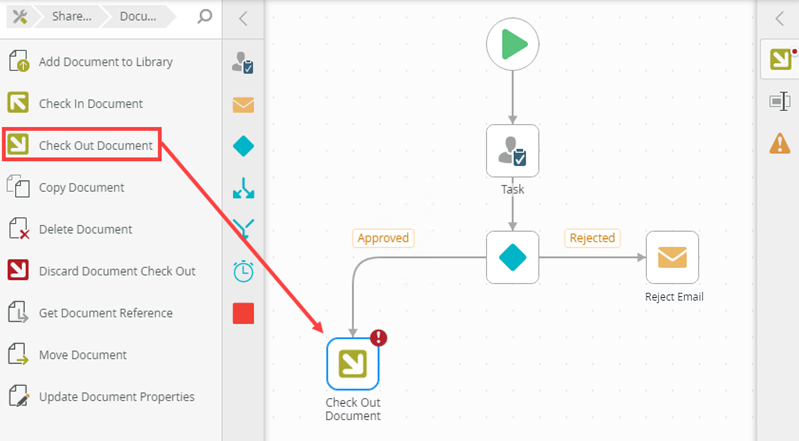 - From the Toolbox click the SharePoint category, the Document category, and then drag the Check Out Document step onto the canvas.