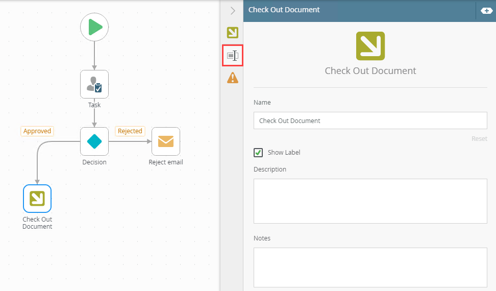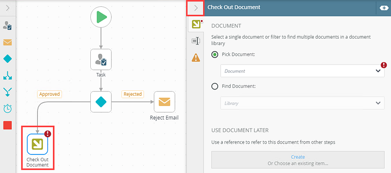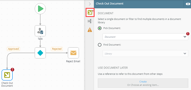 - Select the Check Out Document tab. Use this tab to configure the step's properties.
