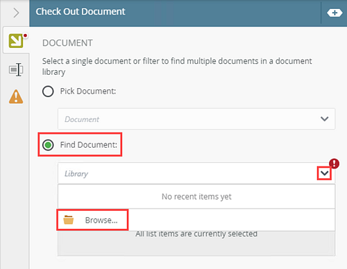| Find Document | Use this to browse to the library containing the desired document. | Click the Find Document radio button to enable this option. Click the menu and select Browse to browse to a specific one. |
