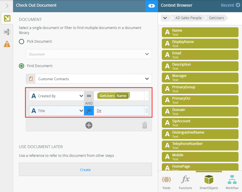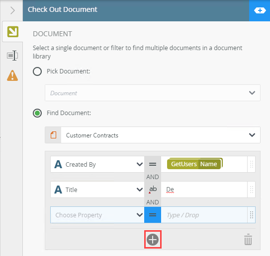 Applying filters is commonly used when the Find Document option is selected. - Select a property from the menu. Select an operator to define the filter. Type values or create dynamic values by dragging Functions,