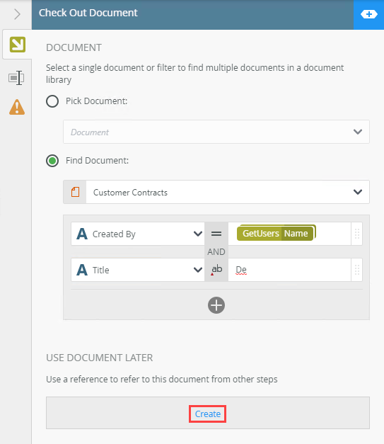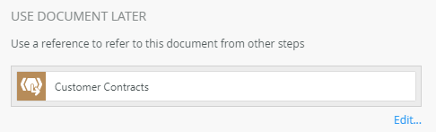 | Use Document Later | Use this option to create a reference to the document that can be used in other steps within the workflow. | Click the Create link to create a reference. Click the Edit link to edit the reference name. If you edited the reference name and want to reset it, click the Reset Name link. |