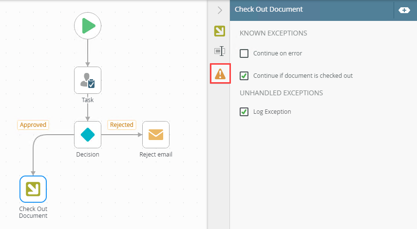 | Continue if document is checked out | On step execution and the added document is checked out (cannot be edited), the following options are available: | Check the check box to continue to the next step if document is checked out. Uncheck the check box causes Runtime exception error. |