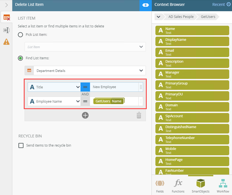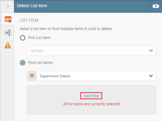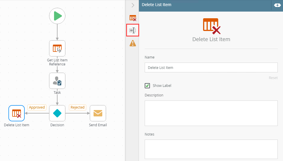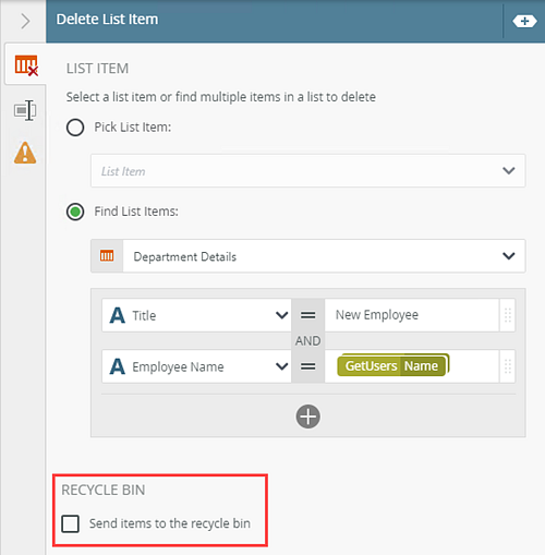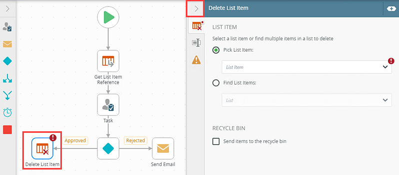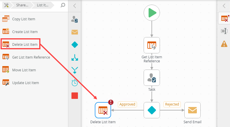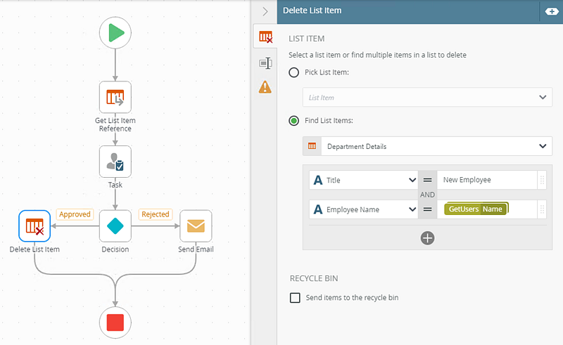Use the Delete List Item step to delete an item from a SharePoint list. You can, for example, use the Delete List Item step in a workflow to delete a list item after its approval is rejected.