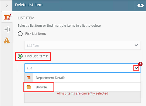 | Find List Items | Use this to browse to the list on a registered SharePoint Site Collection. | Click the Find List Item radio button to enable this option. Click the menu and select Browse to browse to a specific one. |