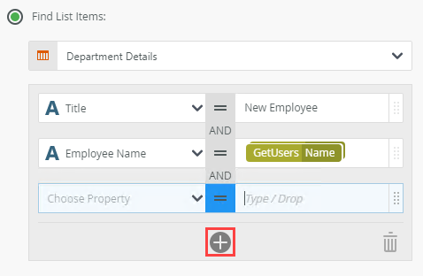 | Filters | The filter section enables you to specify parameters and filters to return data dynamically. Use the operators to refine the filters. Select between the following options: Equal, Not Equal, Starts With, Ends With or Contains Applying parameters and filters is optional. Parameters are dependent on the SmartObject method. | Click the Add Filter link to add filters. Select filter values from the drop-down menu. Click the operator button to select the operator. Click Add to add additional filter properties Type values or create dynamic values by dragging Functions, Fields, SmartObjects and Workflow-related items from the Context Browser into the fields. To delete properties, select them and click the Trash bin. |