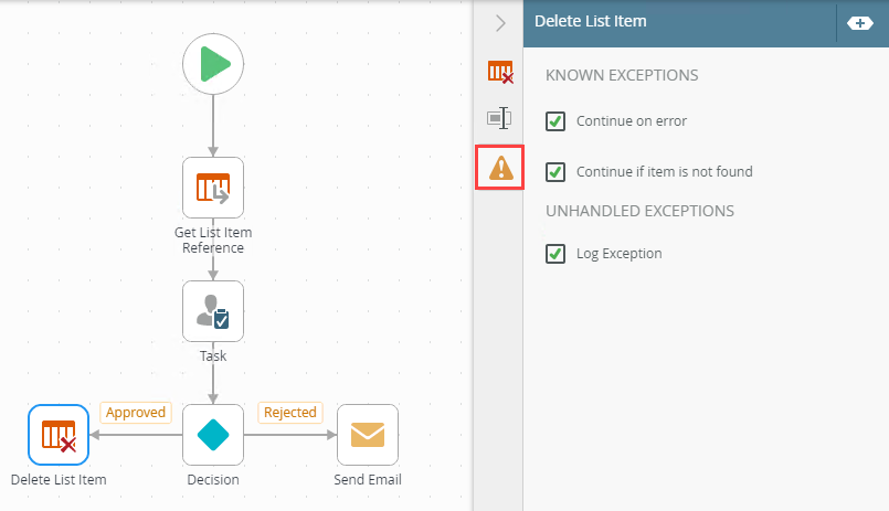 - The exceptions in the table above is an example of those available in Workflow steps. The exceptions available depend on the Workflow step used in the design canvas.