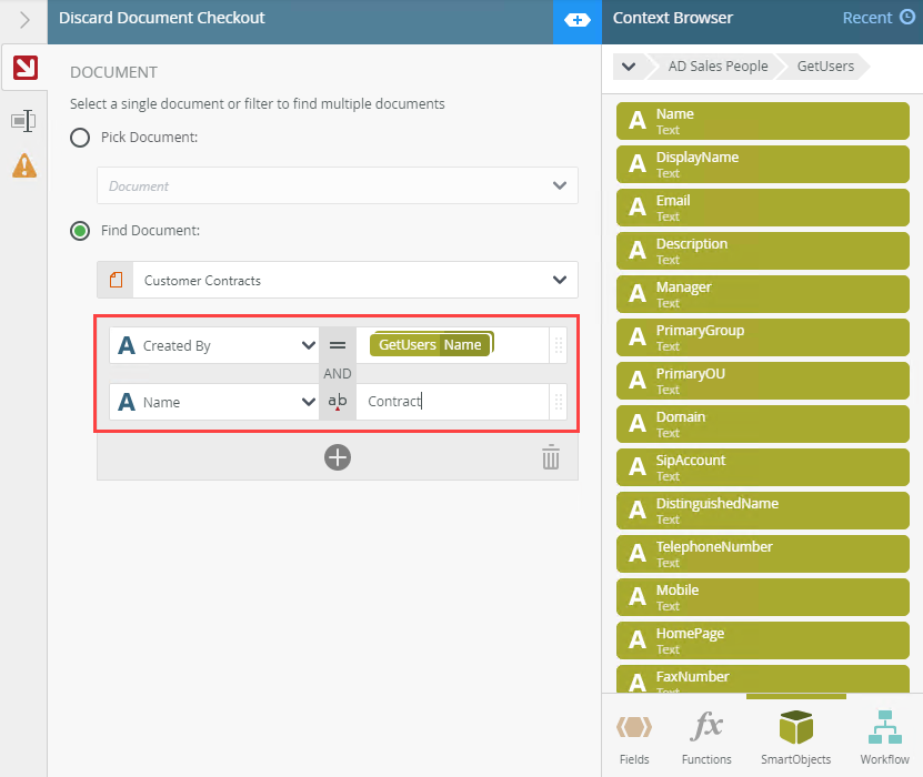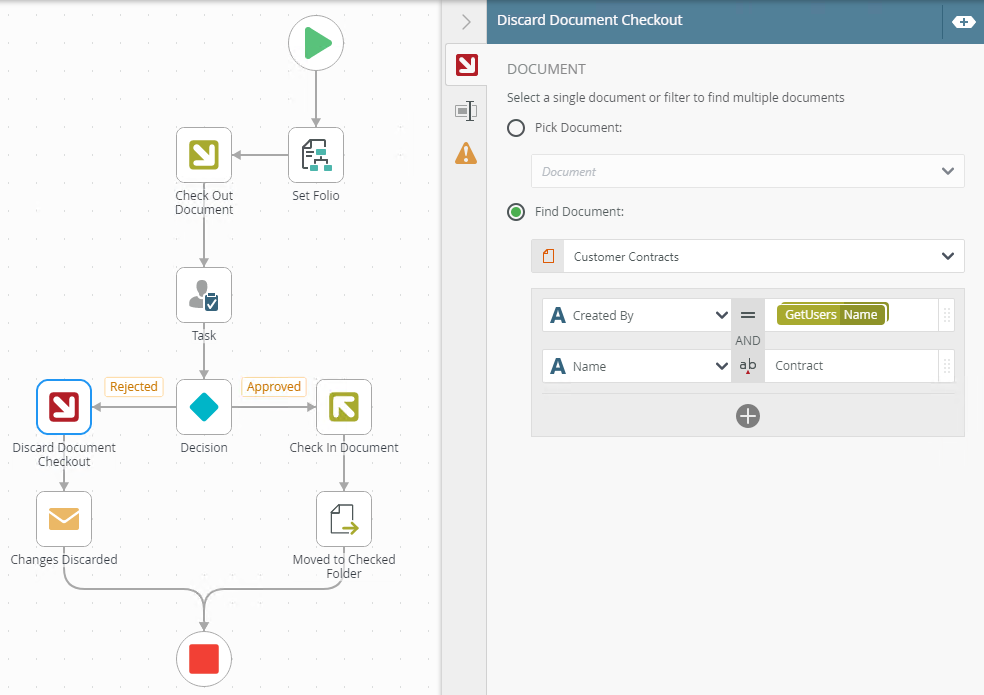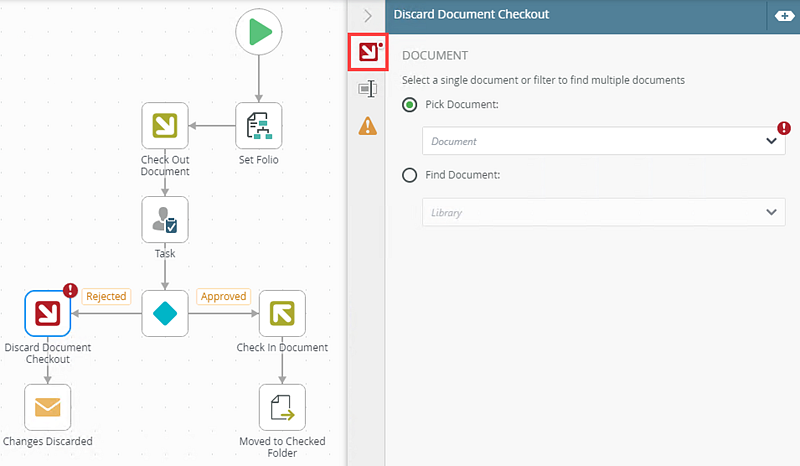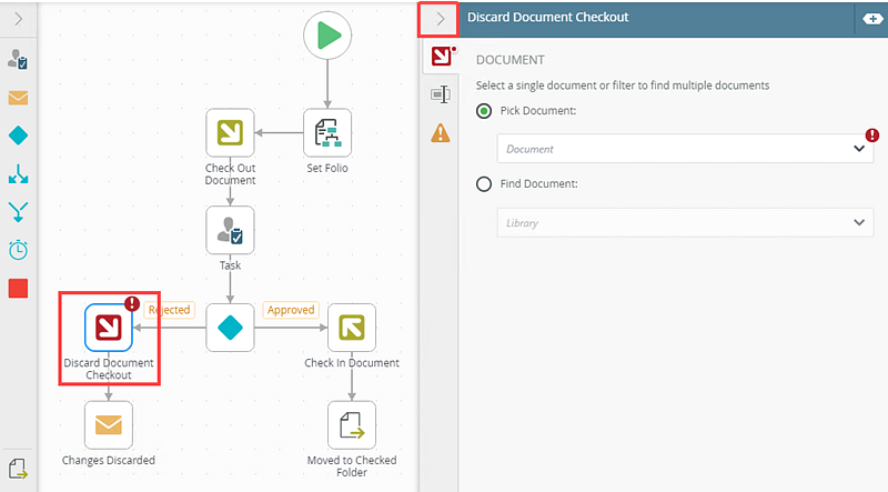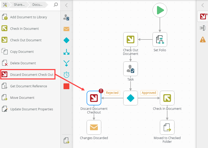 Drag the Discard Document Checkout step from the SharePoint category, Favorites bar, or the Recent category onto the canvas.