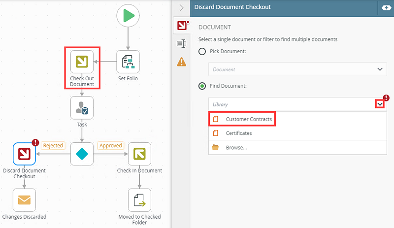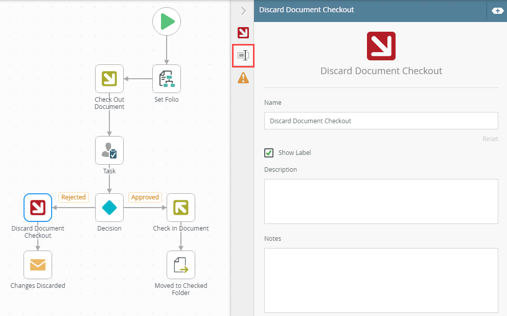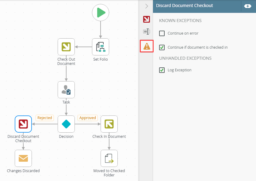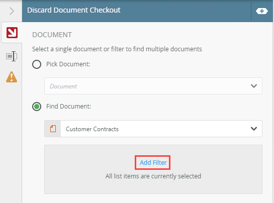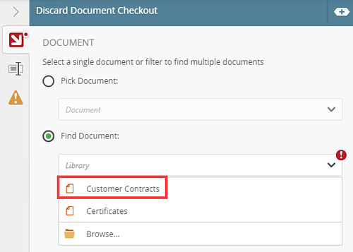 Use the Discard Document Checkout step to discard a check out of a SharePoint document. You can, for example, use the Discard Document Checkout step in a business application to undo any changes made to a document if these changes are not approved.