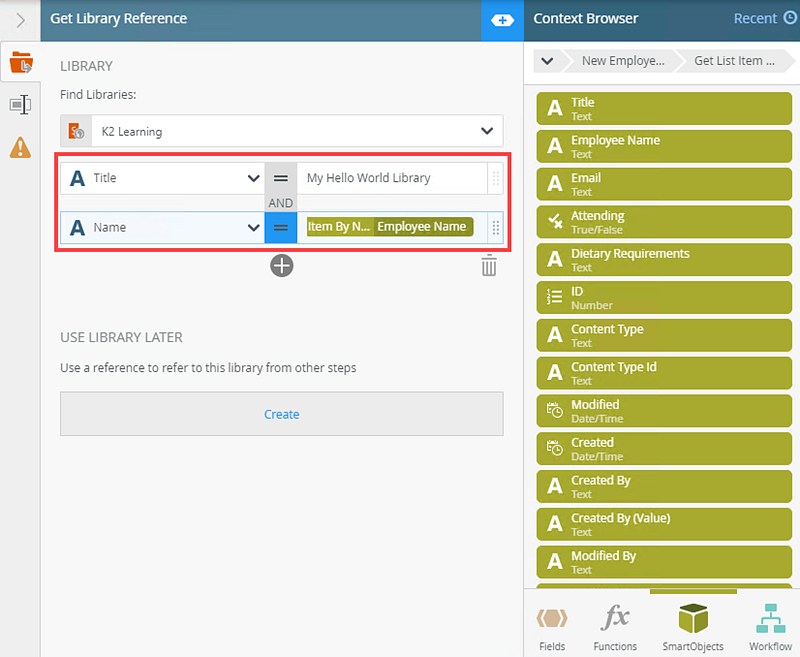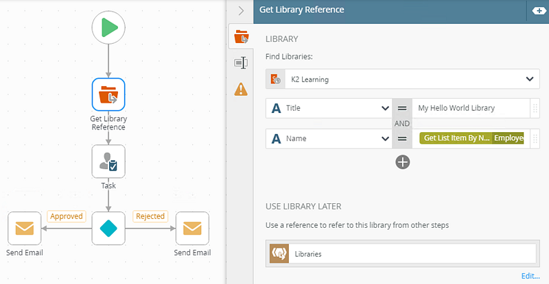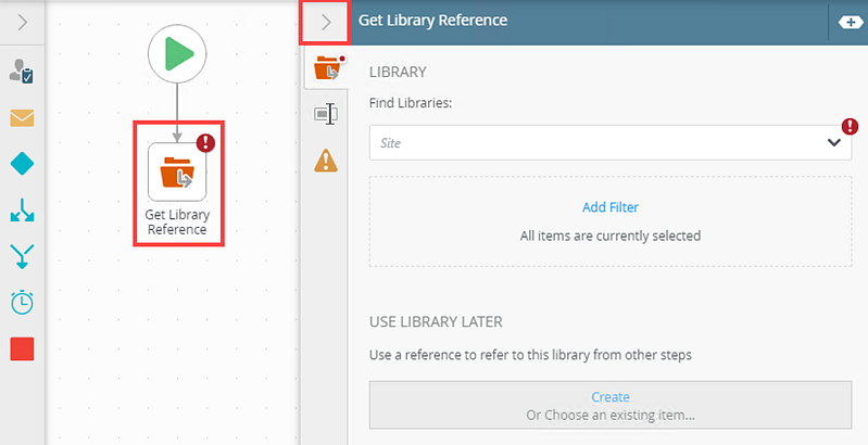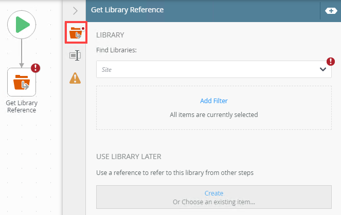 Use the Get Library Reference step to create a reusable reference to a SharePoint library. You can reuse a library reference throughout a workflow. You can, for example, use the Get Library Reference step in the following scenarios: