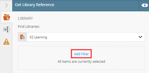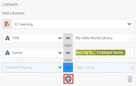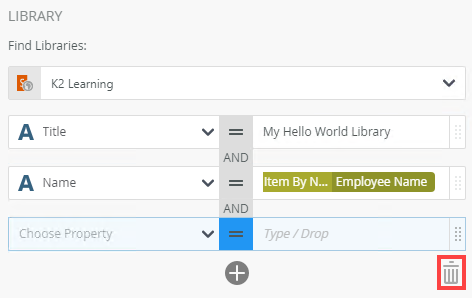 Click the Add Filter link to add filters. Select filter values from the drop-down menu. Click the operator button to select the operator. Click Add to add additional filter properties Type values or create dynamic values by dragging Functions, Fields, SmartObjects and Workflow-related items from the Context Browser into the fields. To delete properties, select them and click the Trash bin. |