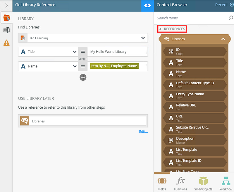 - To locate the added reference, expand the Context Browser, select Fields and then expand the Reference section.