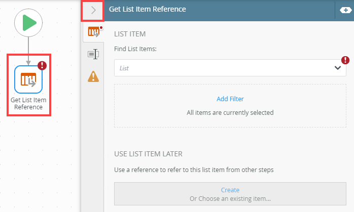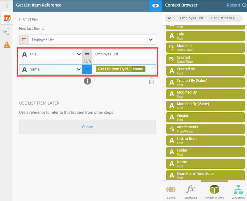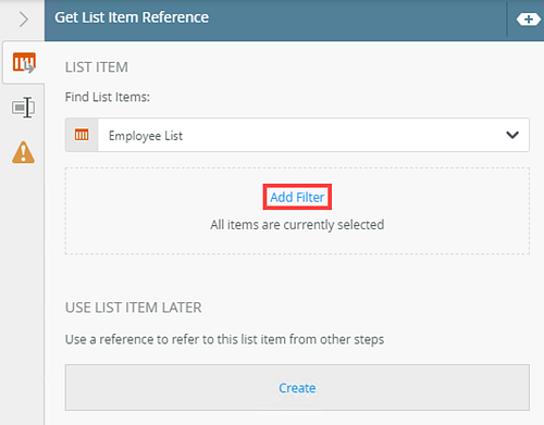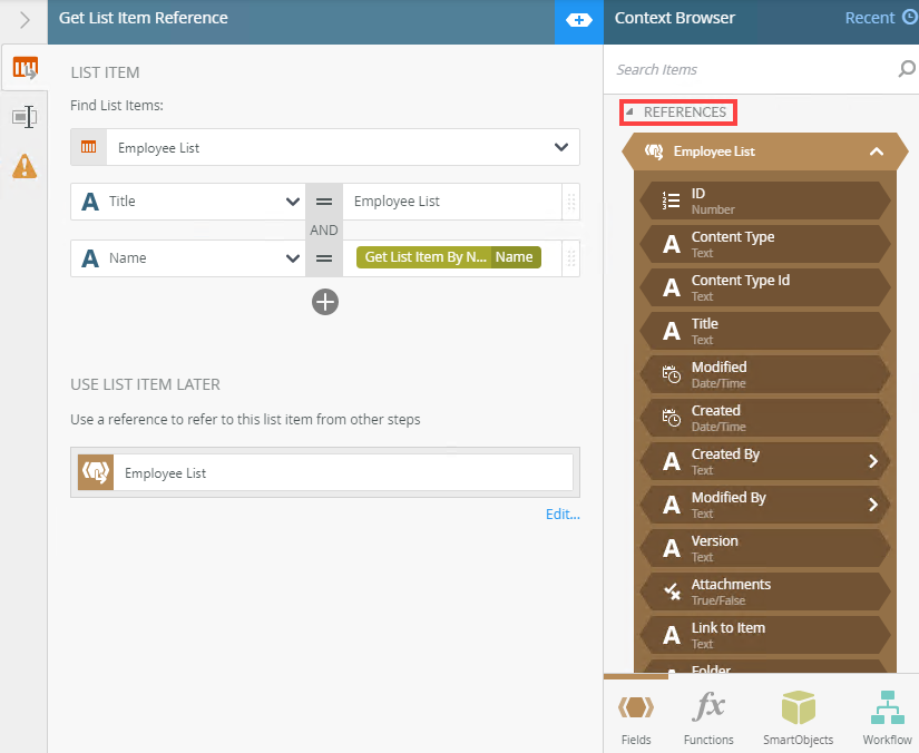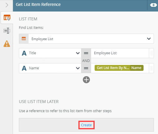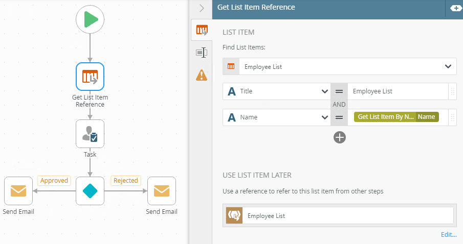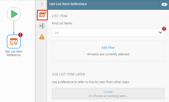 Use the Get List Item Reference step to create a reusable reference to a SharePoint list item. You can reuse a list item reference throughout a workflow.