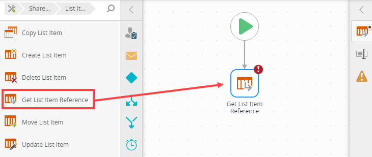 Drag the Get List Item Reference step from the SharePoint category, Favorites bar, or the Recent category onto the canvas.