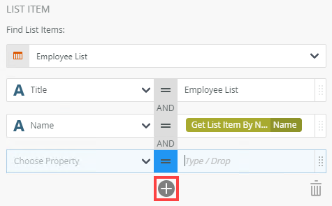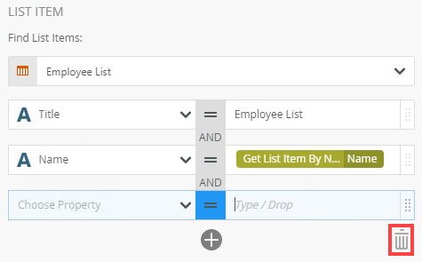Click the Add Filter link to add filters. Select filter values from the drop-down menu. Click the operator button to select the operator. Click Add to add additional filter properties Type values or create dynamic values by dragging Functions, Fields, SmartObjects and Workflow-related items from the Context Browser into the fields. To delete properties, select them and click the Trash bin. |