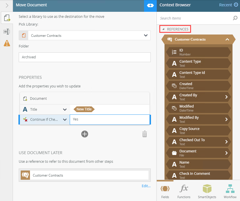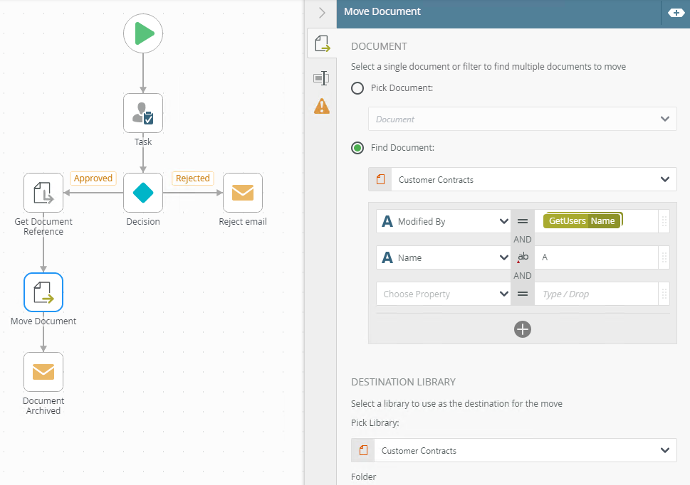 Use the Move Document step to move a document to another SharePoint library or folder within the same library. You can, for example, use the Move Document step in a business application to move documents to an archive folder after a review cycle completes.