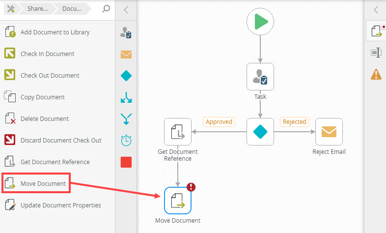 - From the Toolbox click the SharePoint category, the Document category, and then drag the Move Document step onto the canvas.