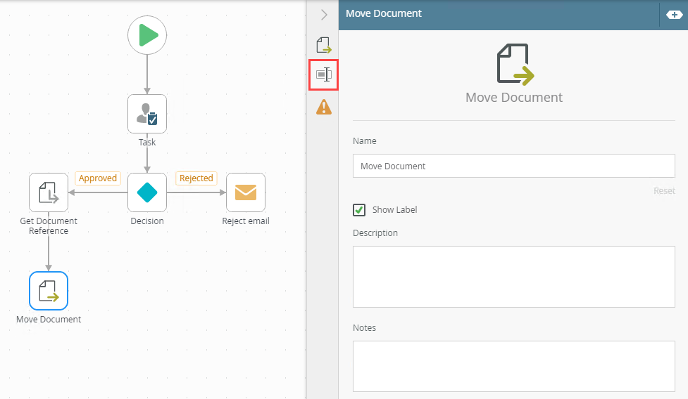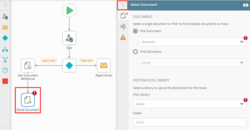 - Select the Move Document tab. Use this tab to configure the step's properties.