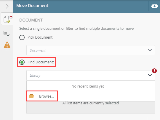 | Find Document | Use this to browse to the library containing the desired document. | Click the Find Document radio button to enable this option. Click the menu and select Browse to browse to a specific one. |
