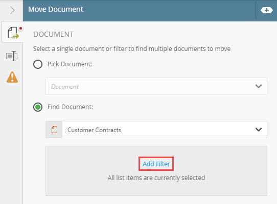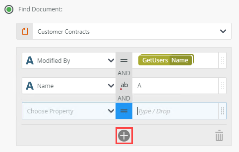 Applying filters is commonly used when the Find Document option is selected. - Select a property from the menu. Select an operator to define the filter. Type values or create dynamic values by dragging Functions,