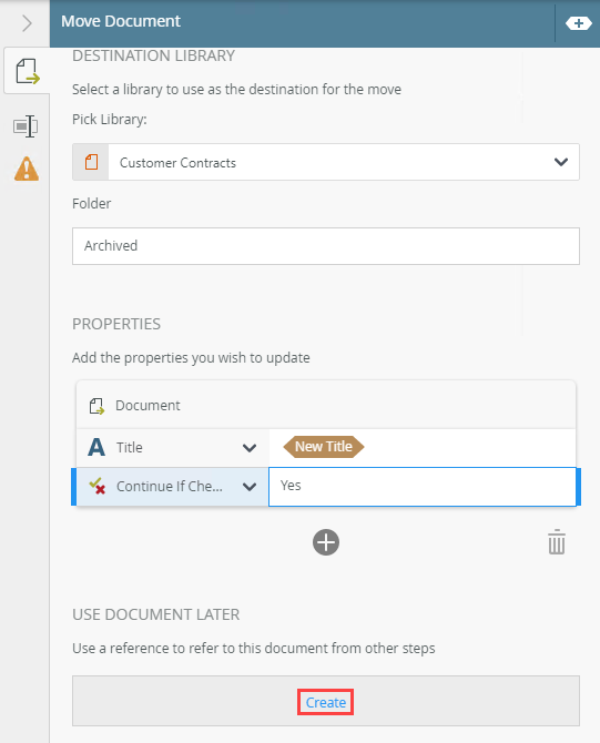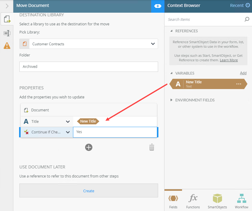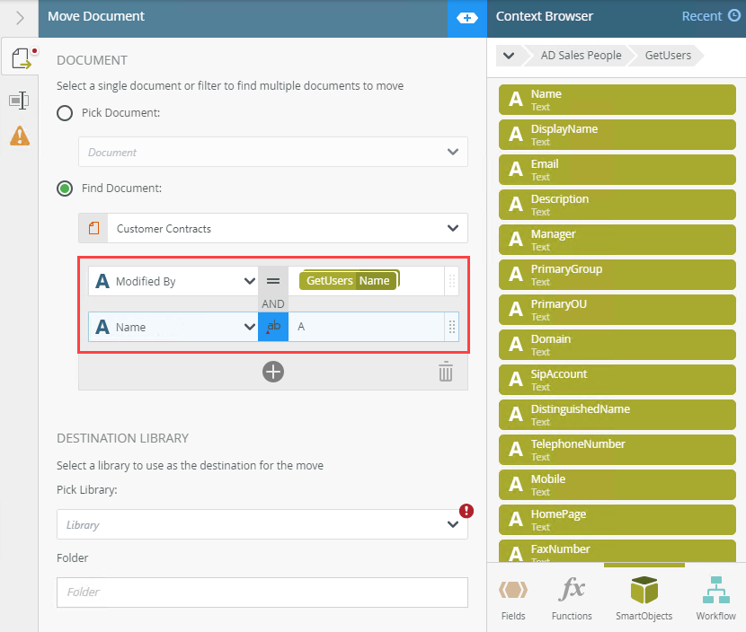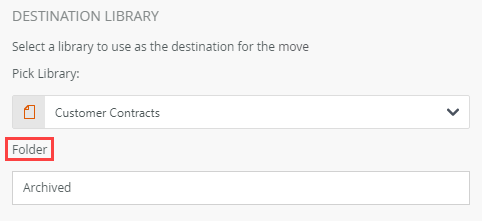 - Specify the folder, in the library, where the document is copied. Type values or create dynamic values by dragging Functions,
