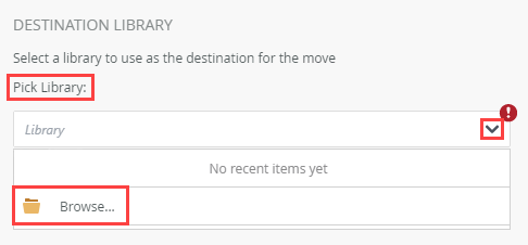 - From the Destination Library section, select a library to use as the destination for the copied document. Select a referenced library from the menu or browse to one using the Browse option. This selection is required.