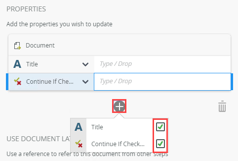 | Properties | Use this to set the filters to determine the document to be updated, and add field details to update the document with. Filter for specified values in one or more fields to identify the document. Type values or create dynamic values by dragging Functions, Fields, SmartObjects and Workflow-related items from the Context Browser into the fields. When a SmartObject load method property is used, an input property is required for the correct information to load. | Click Add to add a property. Click the menu to select the property. Type values or create dynamic values by dragging Functions, Fields, SmartObjects and Workflow-related items from the Context Browser into the fields. To delete properties, select them and click the Trash bin. |