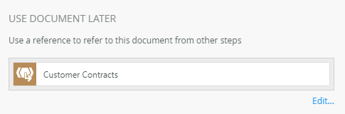 | Use Document Later | Use this option to create a reference to the document that can be used in other steps within the workflow. | Click the Create link to create a reference. Click the Edit link to edit the reference name. If you edited the reference name and want to reset it, click the Reset Name link. |