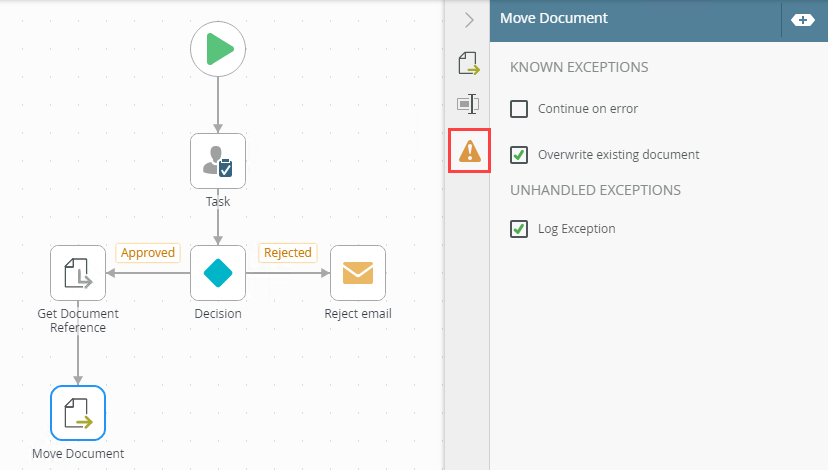 - The exceptions in the table above is an example of those available in Workflow steps. The exceptions available depend on the Workflow step used in the design canvas.