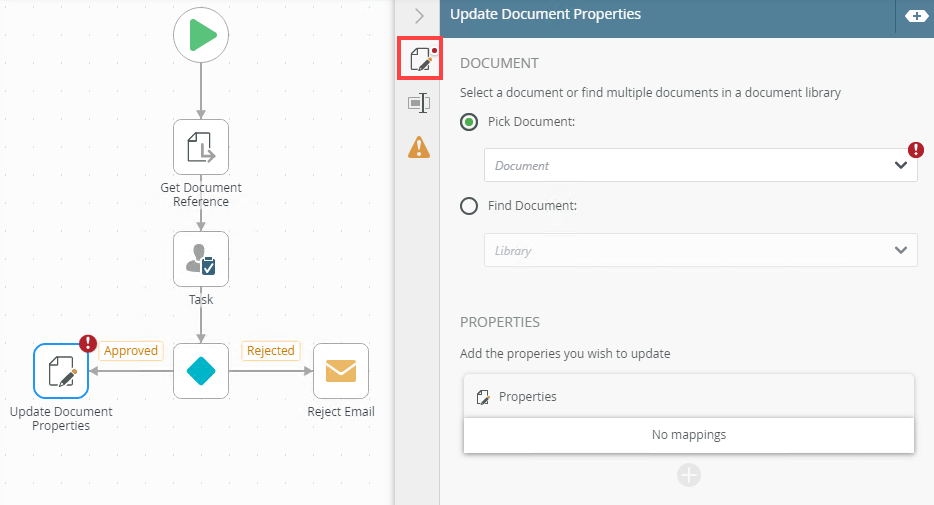 Use the Update Document Properties step to update properties of a document. You can, for example, use the Update Document Properties step in a workflow to change the status of a document once it is approved.