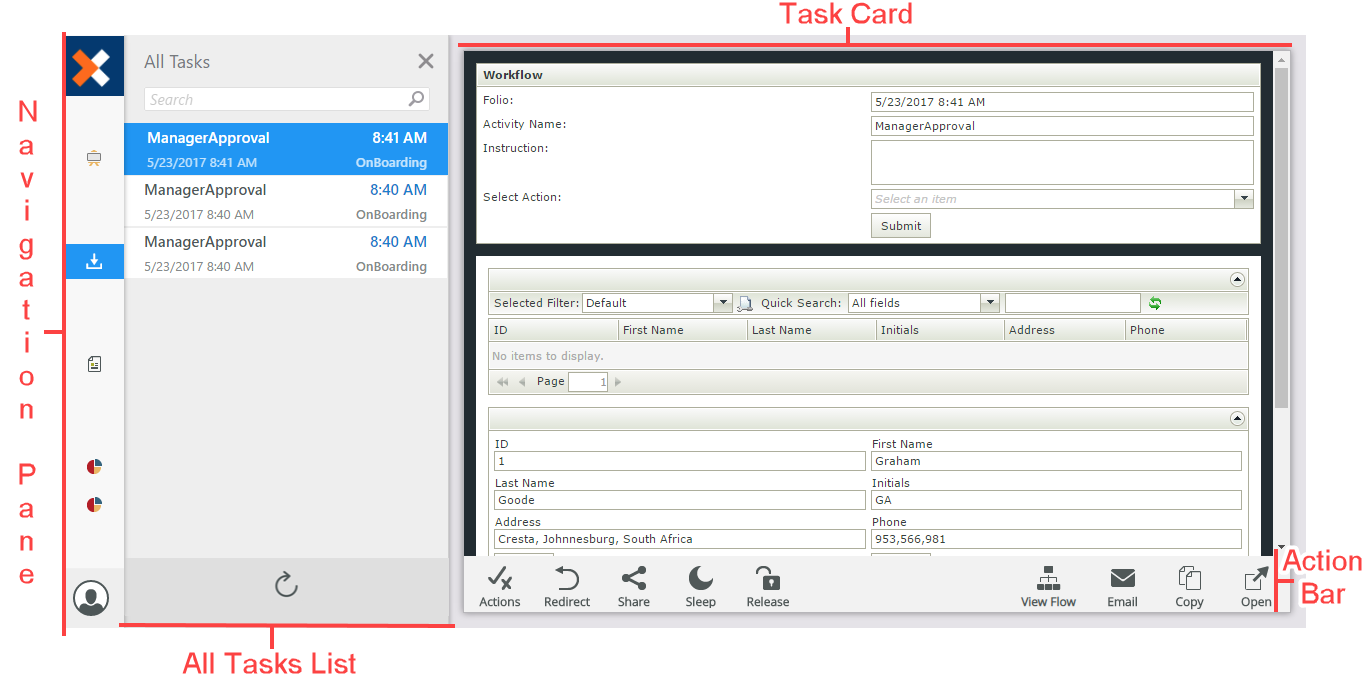 Displays the actions available for the task, such as Approved or Declined, which are defined in the workflow. Click the Show actions while form loads option to see actions while the form loads. Actioning a task via the Task Card removes the task from the Task section, and then loads the next task. If the configured actions can't be actioned without opening the form, they do not appear on the Actions page.