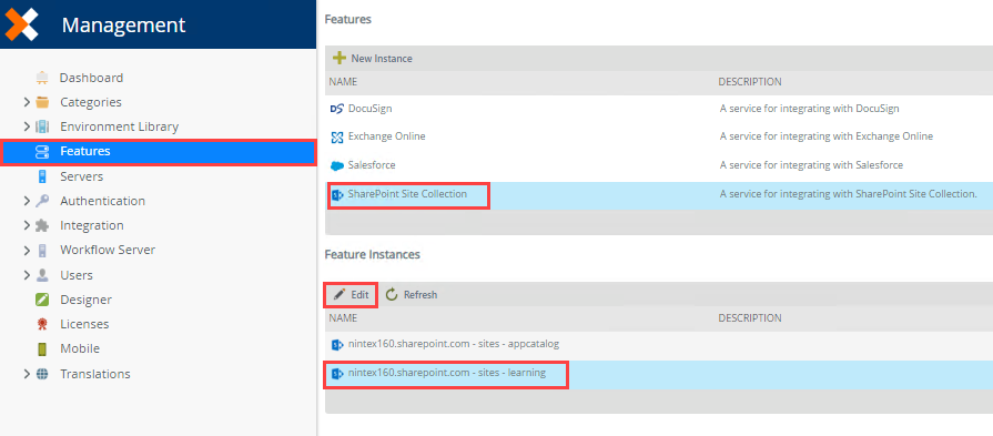 To integrate the new site collection with the product, follow the steps provided in the Configure the Feature Instance in Management section under Install the app and use the new site collection.