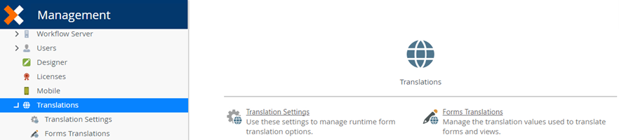 The translation settings for Workspace and Management, Runtime Forms, and Designer can only be set and managed by a user with Admin rights in Management.