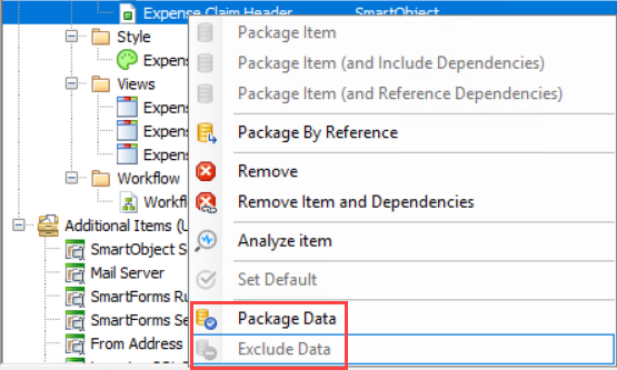 By default SmartObject data is not included, so that SmartBox SmartObject data from one environment is not automatically deployed to a new environment. This is also done to prevent deployment packages from becoming too big. If you need to package the SmartBox data associated with a particular SmartObject, open the SmartObject node and select the option to include data.