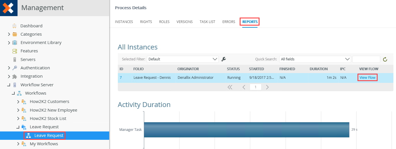 Use the View Flow report to see the current status of a workflow instance and the path followed. It gives you a visual representation of your workflow and helps you to gain more insight into events that occurred during the workflow instance.