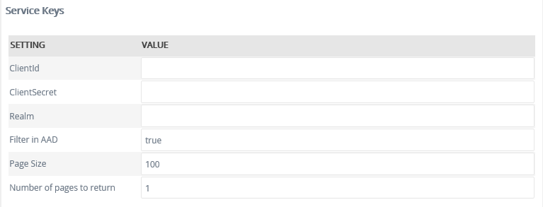 | Page Size | Yes | Text | 1 | Azure Active Directory works on a paged request system, so No of pages to return and Page Size are used together to manage the number of results to return. |