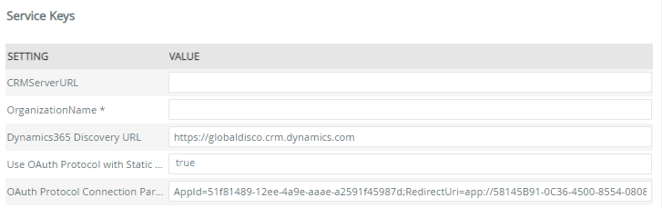 Text | https://globaldisco.crm.dynamics.com | Provide the Dynamics365 Discovery URL for registering cloud CRM service instances. |