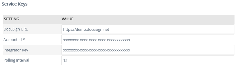 | DocuSign URL | Yes | Text | https://demo.docusign.net | Address for DocuSign's API. By default this is set to the demo URL. Production DocuSign instances will most likely require a different URL. |
