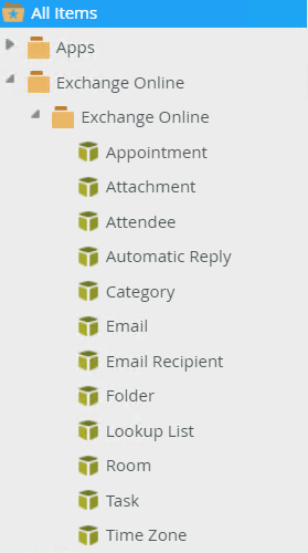 The Exchange Online service type allows you to work with an Exchange server using SmartObjects. This service type uses Exchange's REST-based API. The SmartObjects provide methods for the following Exchange items: