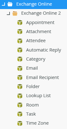 When you create an instance of the Exchange Online feature, the service instance gets created in the Exchange Online folder with the name you give it. You can find the Exchange SmartObjects in this category.
