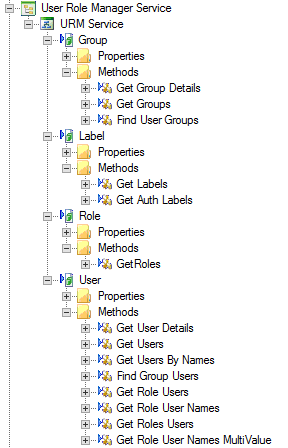 The User Role Manager service instance creates four service objects: Group, Label, Role, and User. See the screen shot below for methods exposed by these service objects.