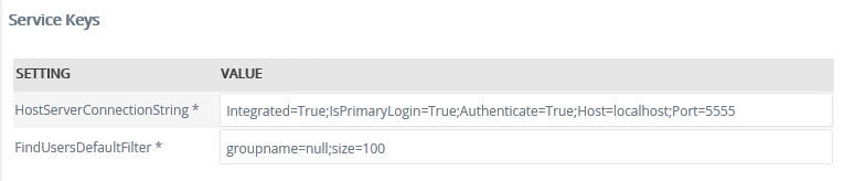 | Host Server Connection String | Yes | Text | Integrated=True;IsPrimaryLogin=True; Authenticate=True; EncryptedPassword=False;Host=localhost;Port=5555 |