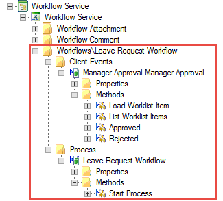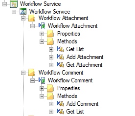 During installation of the product, the Workflow Service service instance creates service objects in the Workflow Service category, which are used by the product to manage comments and attachments to workflow instances. The screen shot below shows the available methods of these service objects.