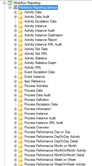 The Workflow Reporting service instance exposes service objects that are categorized based on the type of reporting data returned by the service object.