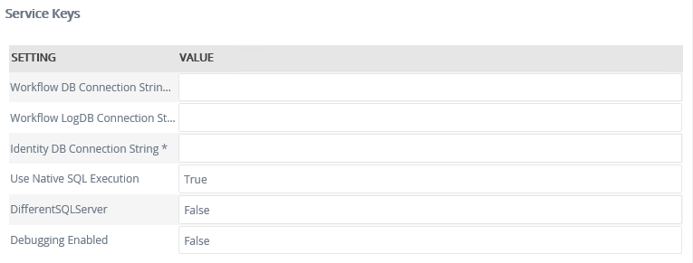 | Workflow DB Connection String | Yes | Text | Data Source=[SqlServerName];Initial Catalog=K2;integrated security=sspi;Pooling=True |